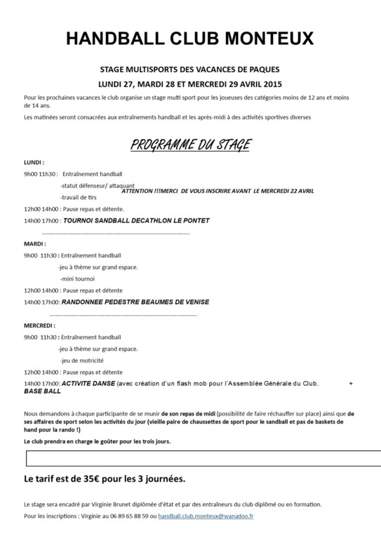 Pendant les vacances scolaires sera organisé un stage multisports pour les catégories -12 ans et -14 ans encadré par Virginie et Myriam sur une durée de trois jours.